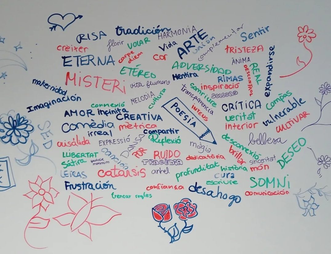 Les alumnes de creació literària han iniciat el trimestre dedicat a la poesia. Com a activitat  de benvinguda, han realitzat un projecte introductori que consisteix a plasmar, de manera artística, què és per elles la poesia. Van començar fent una pluja d’idees i llegint diferents poemes per conèixer les possibilitats comunicatives d’aquest gènere literari, la poesia.